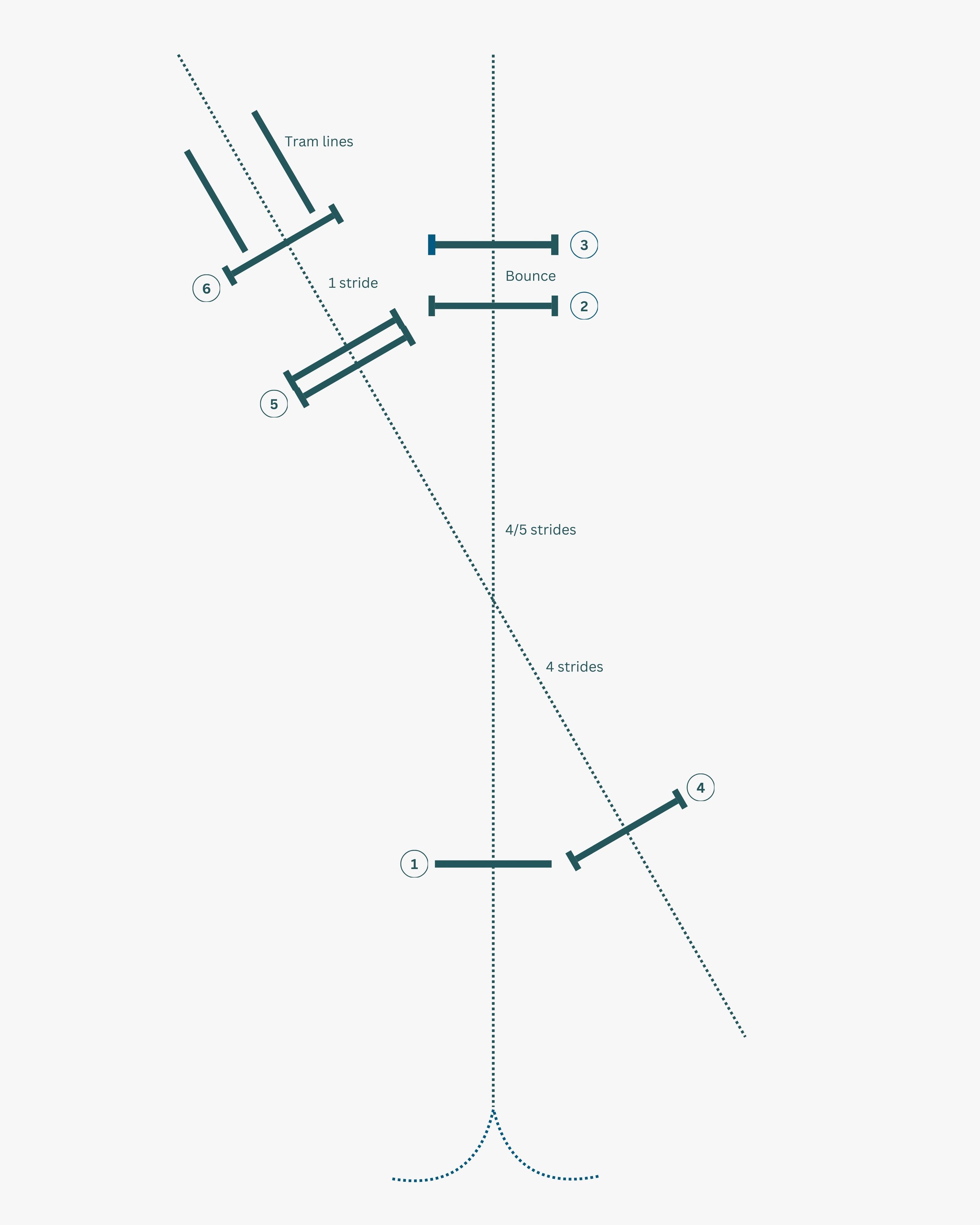 You will need one ground pole, two cross pole fences, two vertical fences, and an oxer for this exercise. Use the diagram above to help you lay out the exercise, ensuring that there is a straight exit from the final fence on the diagonal. You can use two poles on the landing (as shown) to create a gateway that will encourage straightness.